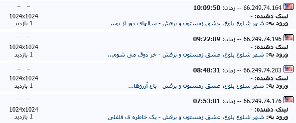 منم همه ی تلاشمو می کنم که از یاد ببرم این روزها یک مخاطب دائم پیدا کردم، بی نام و نشون، که نزدیک ۲۰روزه هرگز یادش نمی ره روزی چند بار به من سر بزنه. اصلا دلم نمی خواد بگم بیاد تا .. در آد! چون اصلا دلم نمی خواد این پستو این شکلی اش کنم. و حتی تو زبونم نمی چرخه این شکلی بهش بگم، اما خب دیگه فکر کنم تابلوئه که لجم رو در آورده! اما خب از همین تریبون اعلام می کنم که هر چه قدر دلت می خواد بیا... اینجا شلوغه... امیدوارم تو شلوغی اش گم نشی... این عکسا پایین هم گوشه ی کوچیکی از حضورش...ایشون تو وب یکی از دوستان هم به همین منوال اینجا حضور دارند. اگر کسی با چنین آی پی ای تو وبتون حضور داره لطفا بگید...